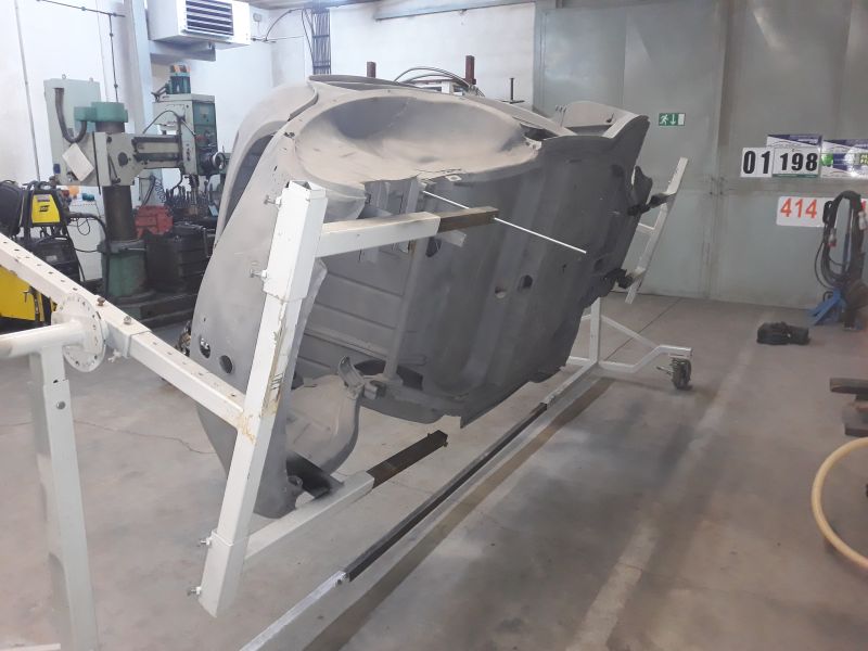 Montáž karosérie na otočný stojan, aby sa dala ľahko nastriekať antikoróznou základnou farbou. |